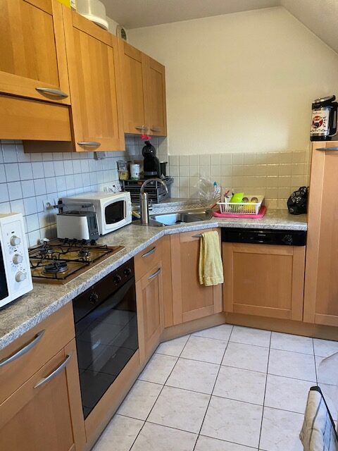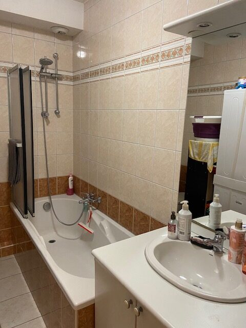 Entrée – cuisine aménagée & équipée (hotte – plaque – four – réfrigérateur – lave-vaisselle) ouverte sur le séjour – 1 chambre – salle de bain avec baignoire & WC.