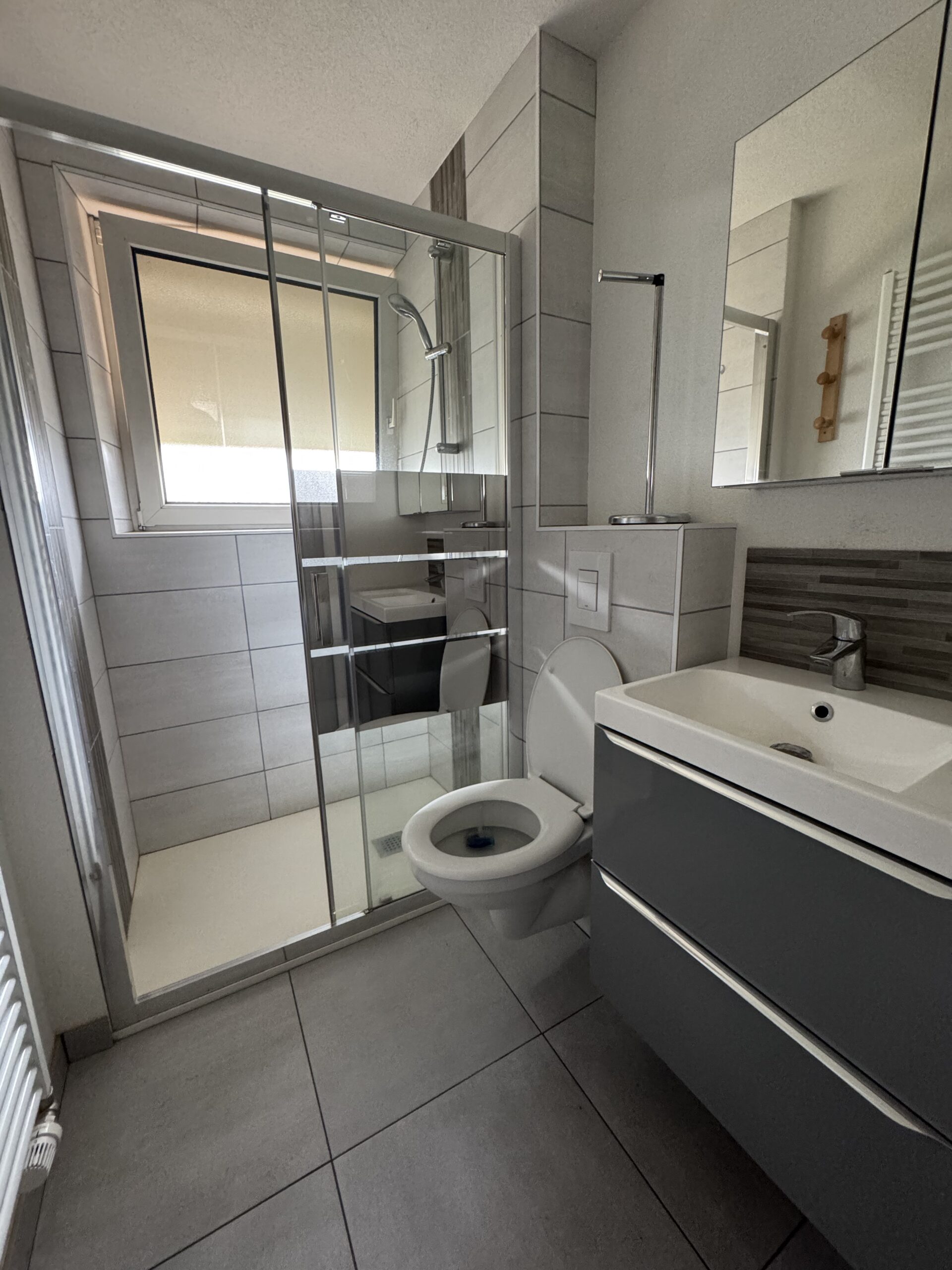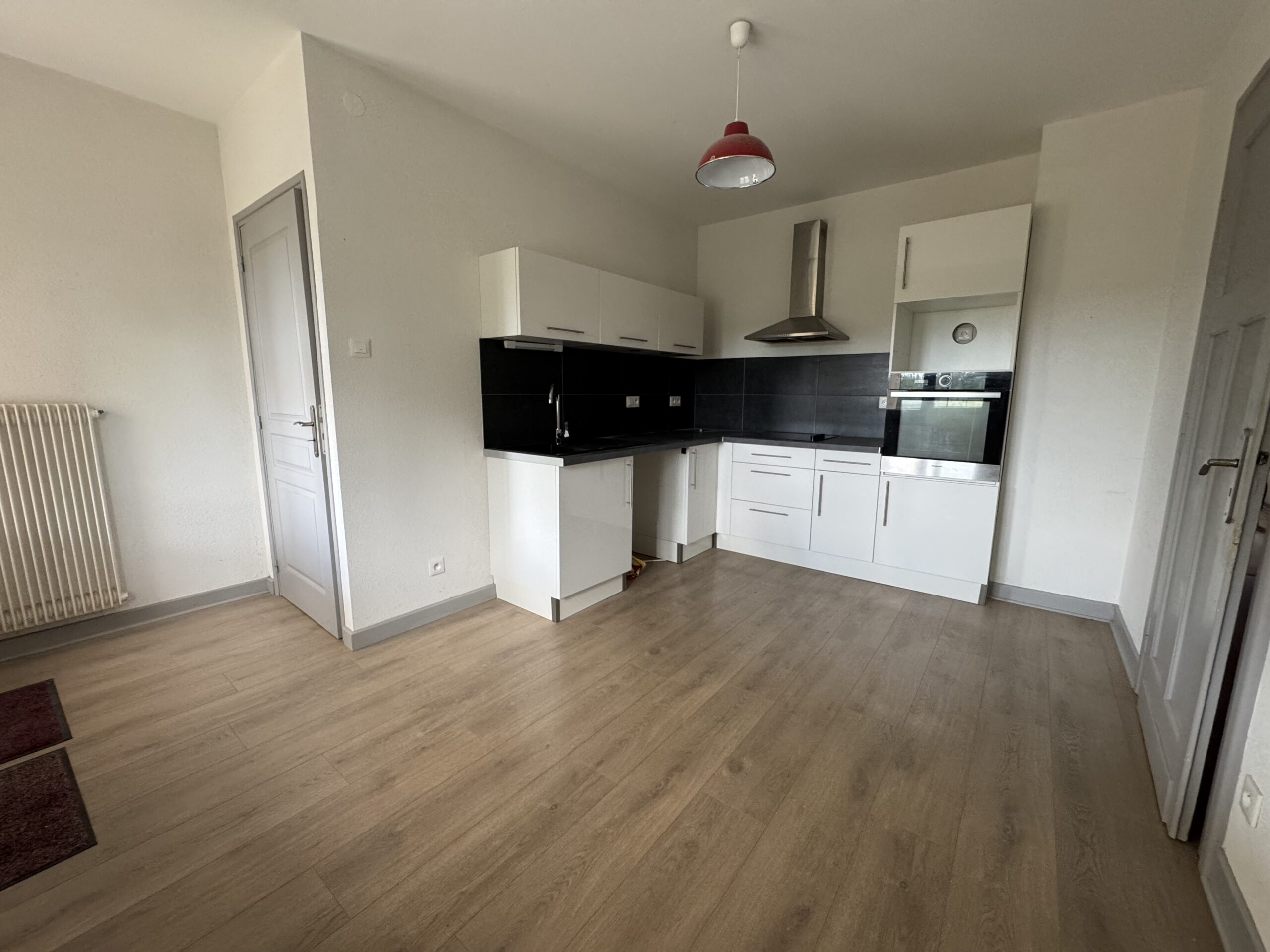 Entrée – cuisine aménagée & équipée (hotte – plaque – four) – grand séjour – 2 chambres – salle de bain avec douche & WC.