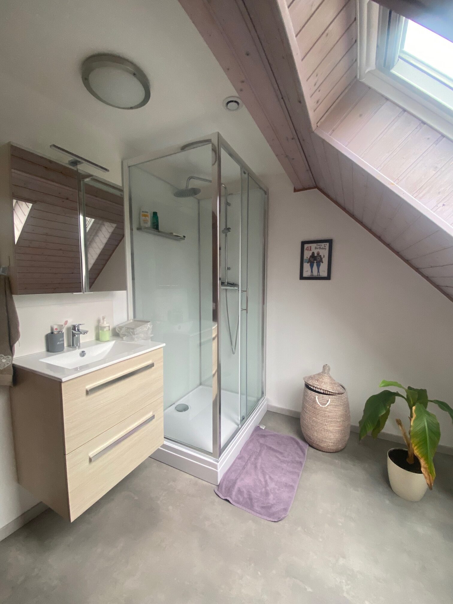 A l’étage : 2 chambres avec rangements – salle de bain avec douche – WC